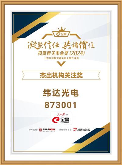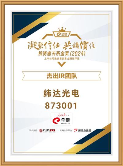 2025年8月27日,第六届全景投资者关系金奖榜单揭晓,新葡萄奔驰AMG官网公司光电凭借专业高效的投资者关系管理表现,获得“杰出IR团队”和“杰出机构关注奖”两大奖项,充分彰显机构投资者对公司治理水平、信息披露质量及发展前景的高度认可。