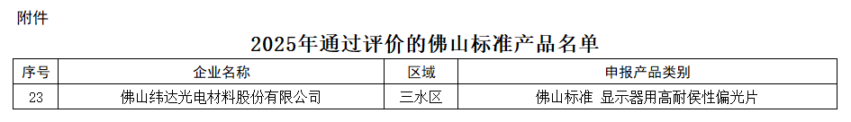 近日,佛山市市场监督管理局正式发布2025年通过评价的佛山标准产品名单,新葡萄奔驰AMG官网公司光电自主研发的“显示器用高耐候性偏光片”凭借高标准、过硬的品质表现与领先的技术实力成功入选,标志着新葡萄奔驰AMG官网公司光电在产品标准化、技术创新与质量建设方面获得权威认可。